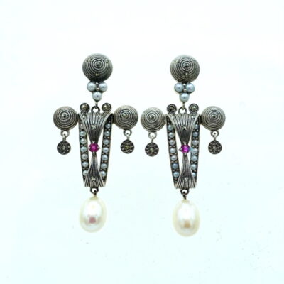 925er Silber Ohrstecker im Josephine Baker Stil mit Perlen und Rubin. Länge ca. 55mm, Breite ca. 25mm