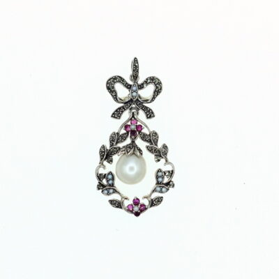 Opulenter 925er Silber Anhänger mit Perle, Rubinen und Markasiten. Länge ca. 45mm, Breite ca.23mm