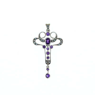 925er Silber Anhänger mit Amethyst und Perlen. Länge ca. 50mm, Breite ca. 27mm