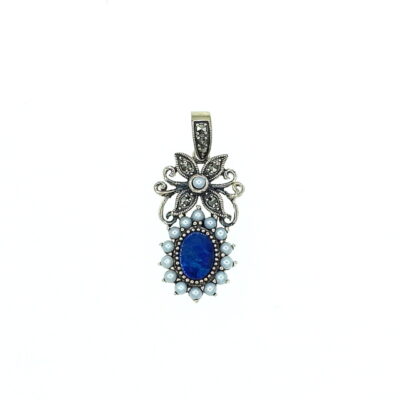 925er Silber Anhänger mit blauem Opal, Perlen und Markasiten. Länge ca. 30mm, Breite ca.12mm
